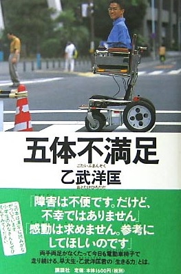 書中一開始翻開這本書,看到這句話:「即使身體殘障,我每天還是很開心。」這令我感到有點訝異,有些人四肢健全,卻過著消沉暗淡的人生,而乙武洋匡即始身體殘障,卻能活得快樂自在,使我不禁想把這本書分享給大家。他小學時候,老師故意刁難他,刻意嚴苛管教,譬如藉口讓乙武洋匡多活動身體增加體力,規定他禁止使用電動輪椅。不過這些困難並沒有難倒他,反而更加勇往直前,絕不退縮,又積極參加各種活動,擴大了自己的社交圈子,反映出他對生命充滿樂觀和熱愛的精神,反映出五體是否不健全,跟人生幸福與否跟本毫無關聯。這本書讓我看見了希望,也清楚告訴我們人生樂觀進取,來肯定自己的生活價值,而且生命要自己來創造,而不是可憐的靠別人安排,作者正是個可取的例子。看自己所擁有的。不過,我們往往不懂得加以珍惜,更加得過且過,遇到挫折時,只是一味的怨天尤人,那麼失敗是必然的,相反的一個肢體障礙者能酷愛生命,充滿勇氣過著平常的生活,造就出一個健康燦爛的生活,相對起乙武洋匡的故事,我們是多麼的渺小,多麼微不足道啊。還有那些禁不起現實而輕生的人,若是能把這故事分享給他們,他們便能知道擁有的比乙武洋匡多,便也不會想自殺了吧!